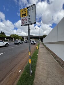 この3つのバスはアラモアナショッピングセンターの山側から出発してから海側に迂回し、再度、海側にあるバス停で停まります。